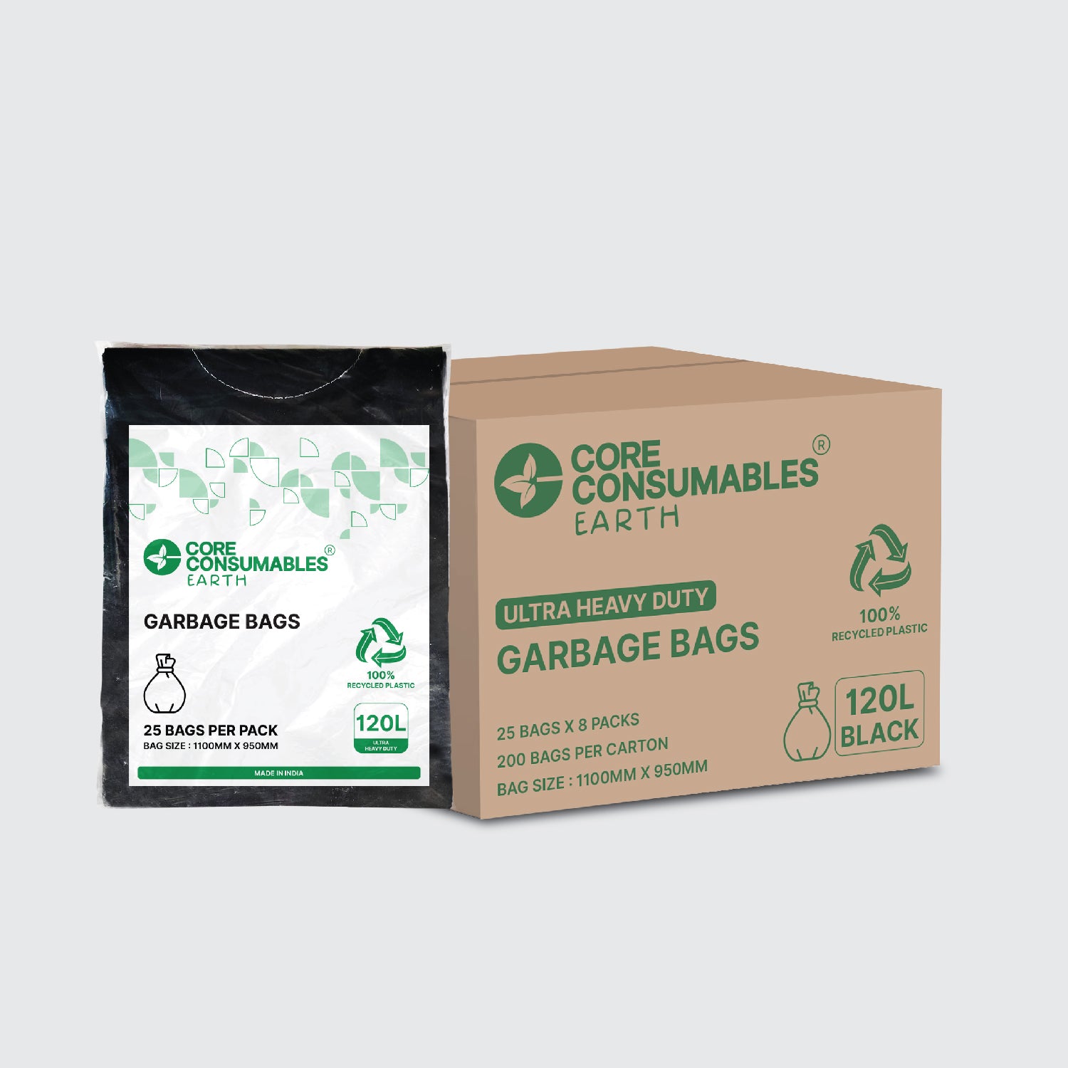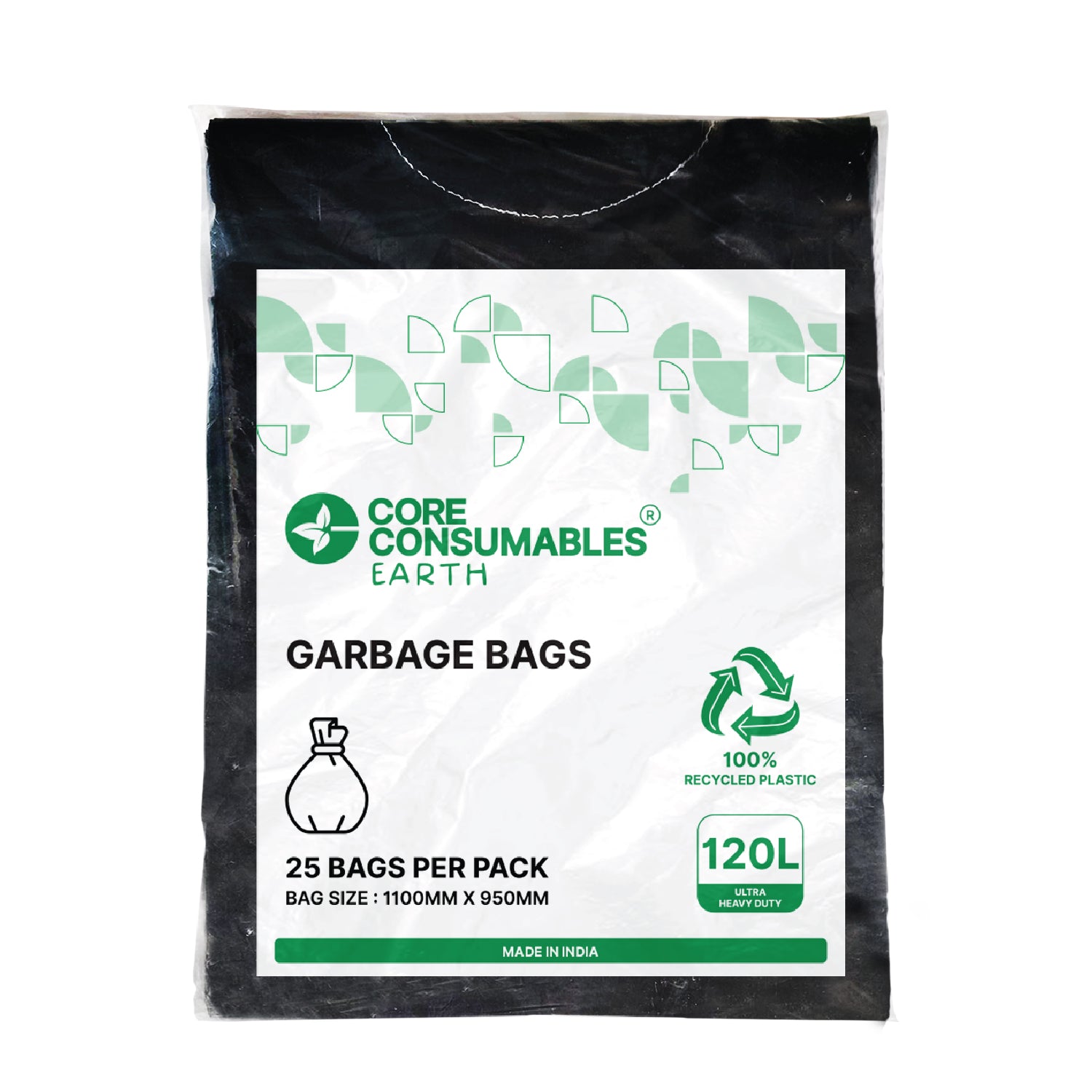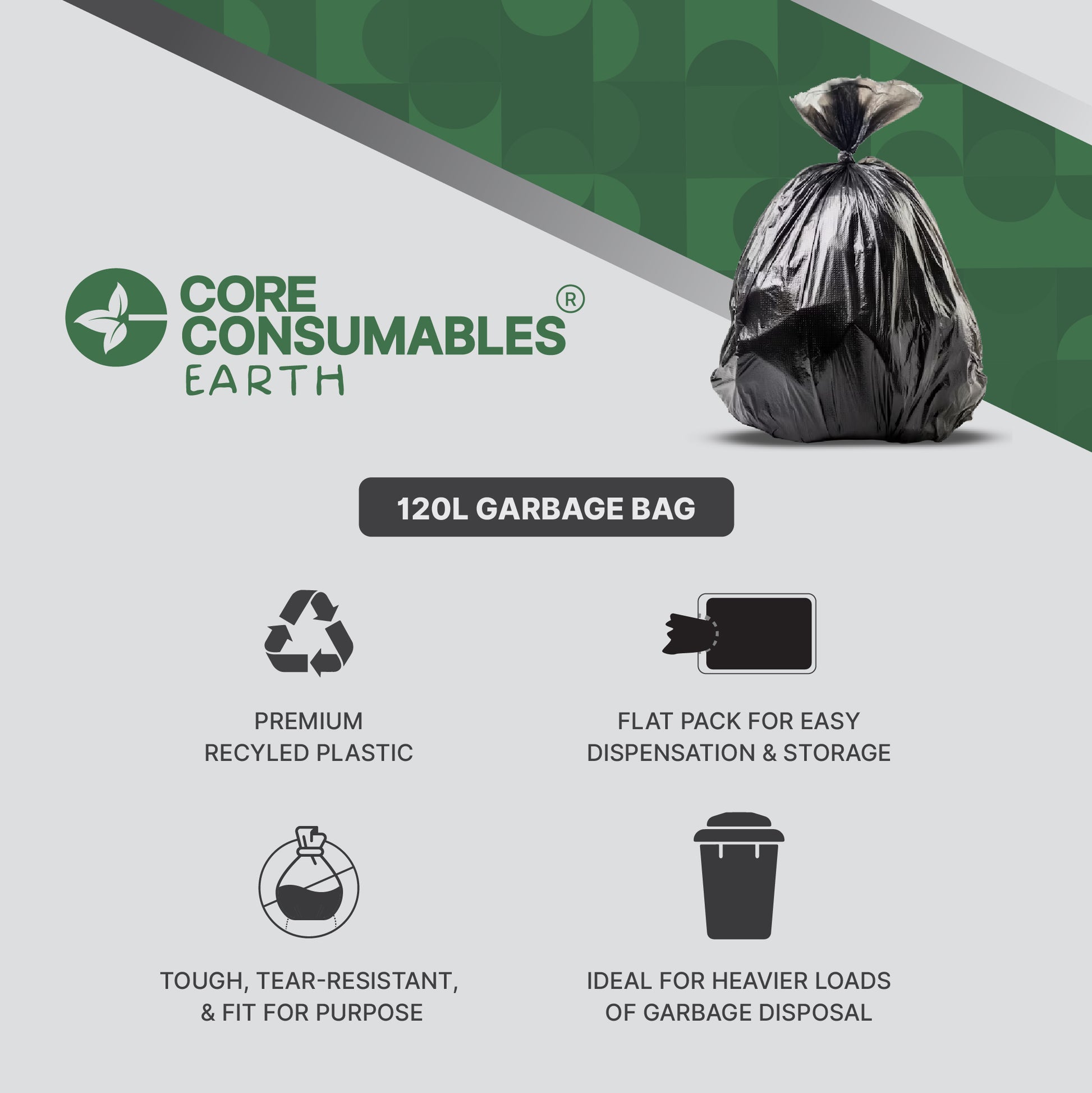 Core Consumables 120L Ultra ExtraHeavy Duty Garbage Bags – your go-to solution for robust waste management made sustainably. Crafted from 100% recycled plastic, these bags combine strength with eco-consciousness.